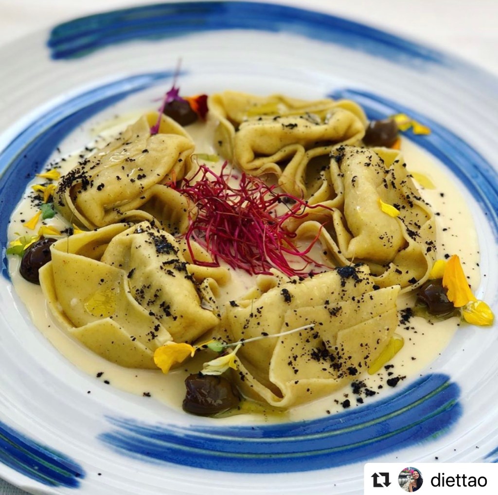 用熏制的土豆絲烤製的意大利餃子,內餡兒是突唇白鮭和意大利乳清乾酪。餃子是手工做的,非常有嚼勁且具有濃厚的義大利起司香。