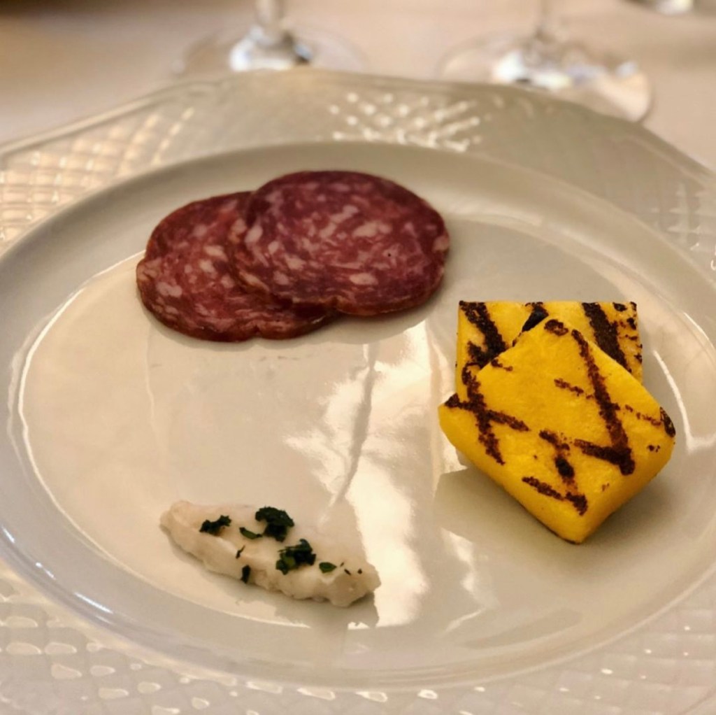 前菜- 典型曼托瓦式沙拉,內含玉米粥,義式豬油塊以及煙燻培根肉
