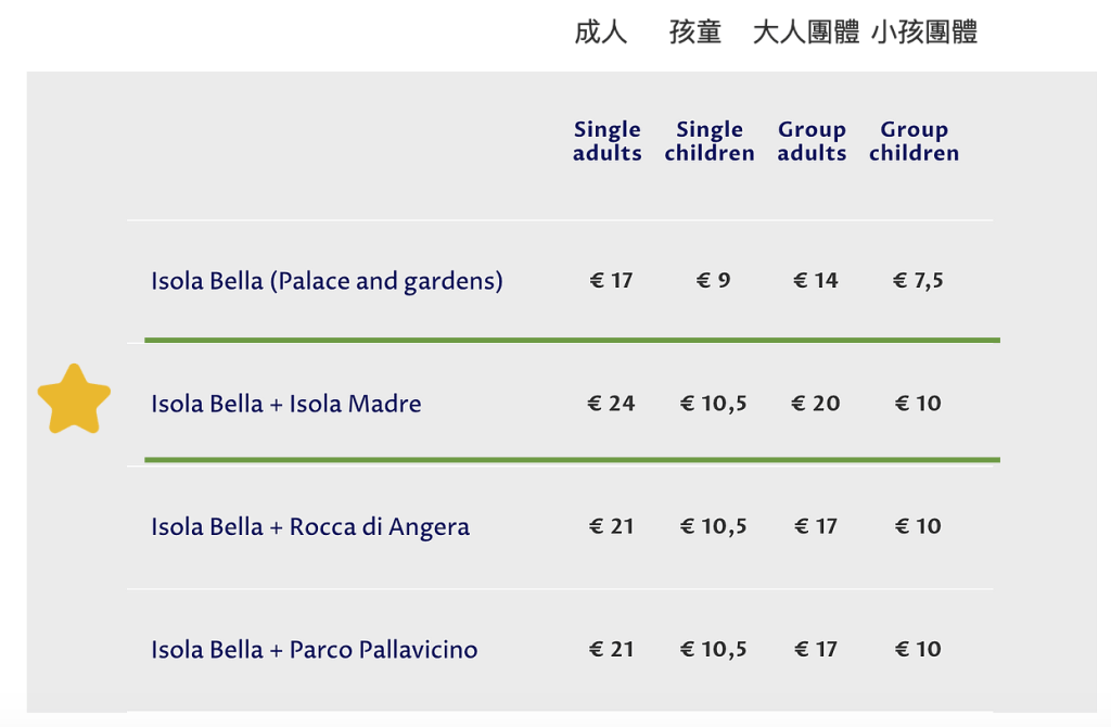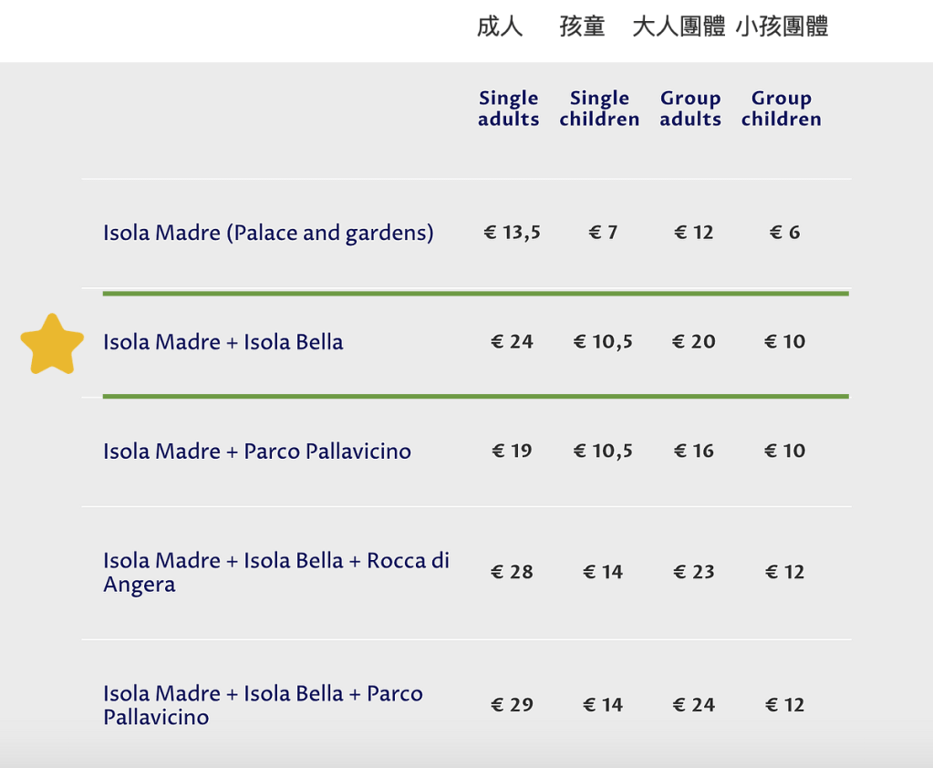 我個人的建議是買貝拉島Isola Bella+母親島Isola Madre ,因為這個母親島也是我推薦的必看景點之一喔~一起買比較划算!