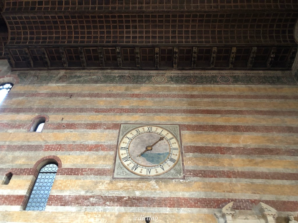 從照片中可以清楚地看見,隱修教堂的天花板十分的特別,是一個立體的船體天花板,這是由一位是一位傑出的城市規劃師,水管工和工程師- Frà Giovanni degli Eremitani 所建(1306)。由於其構造極為複雜,所以也成為了一個參觀的重點之一。