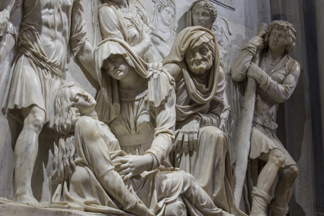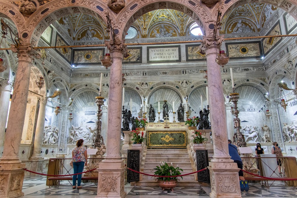 在牆壁上你可以看見兩幅巨作,互相對應著。上面那一幅是安東尼奧·巴萊斯特拉 (Antonio Balestra)創作於1718 的作品,描繪了聖徒科斯馬斯和達米安的殉難場景。而下面這一幅則是塞巴斯蒂亞諾·加爾瓦諾 (Sebastiano Galvano) 的《無辜者大屠殺》創作於 16 世紀中葉。
