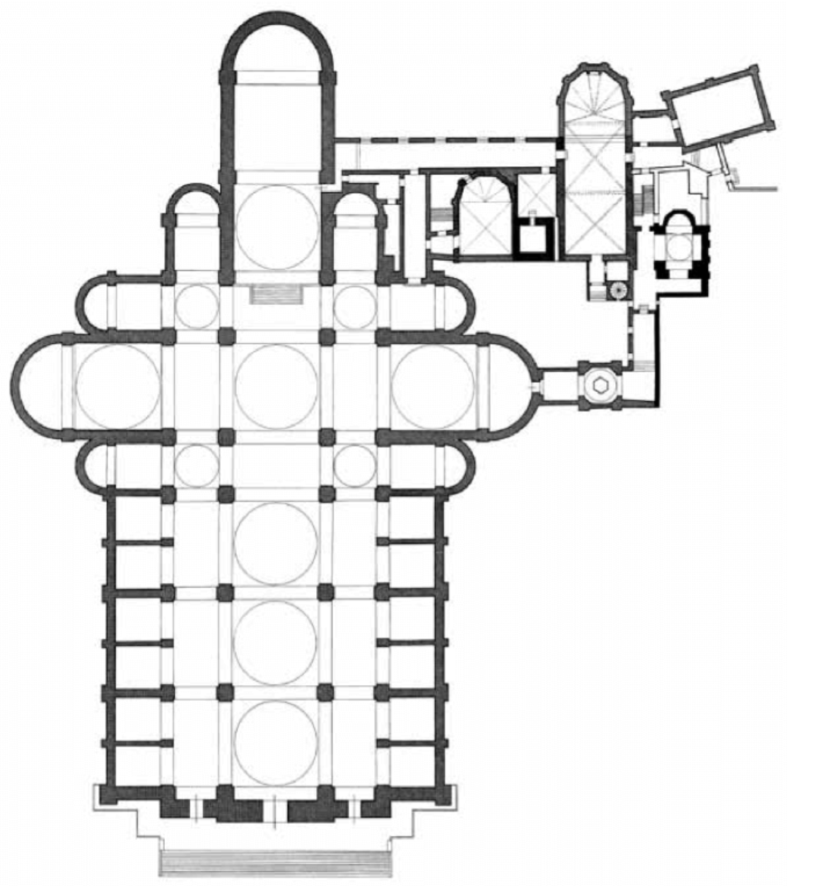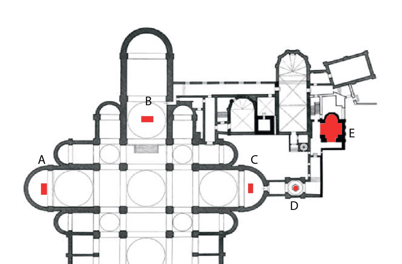 從教堂的平面圖可以發現,這間教堂設計極為複雜,總共是由三個主要的主小教堂跟兩側的小教堂外加旁邊另外兩個連通的小教堂組成。