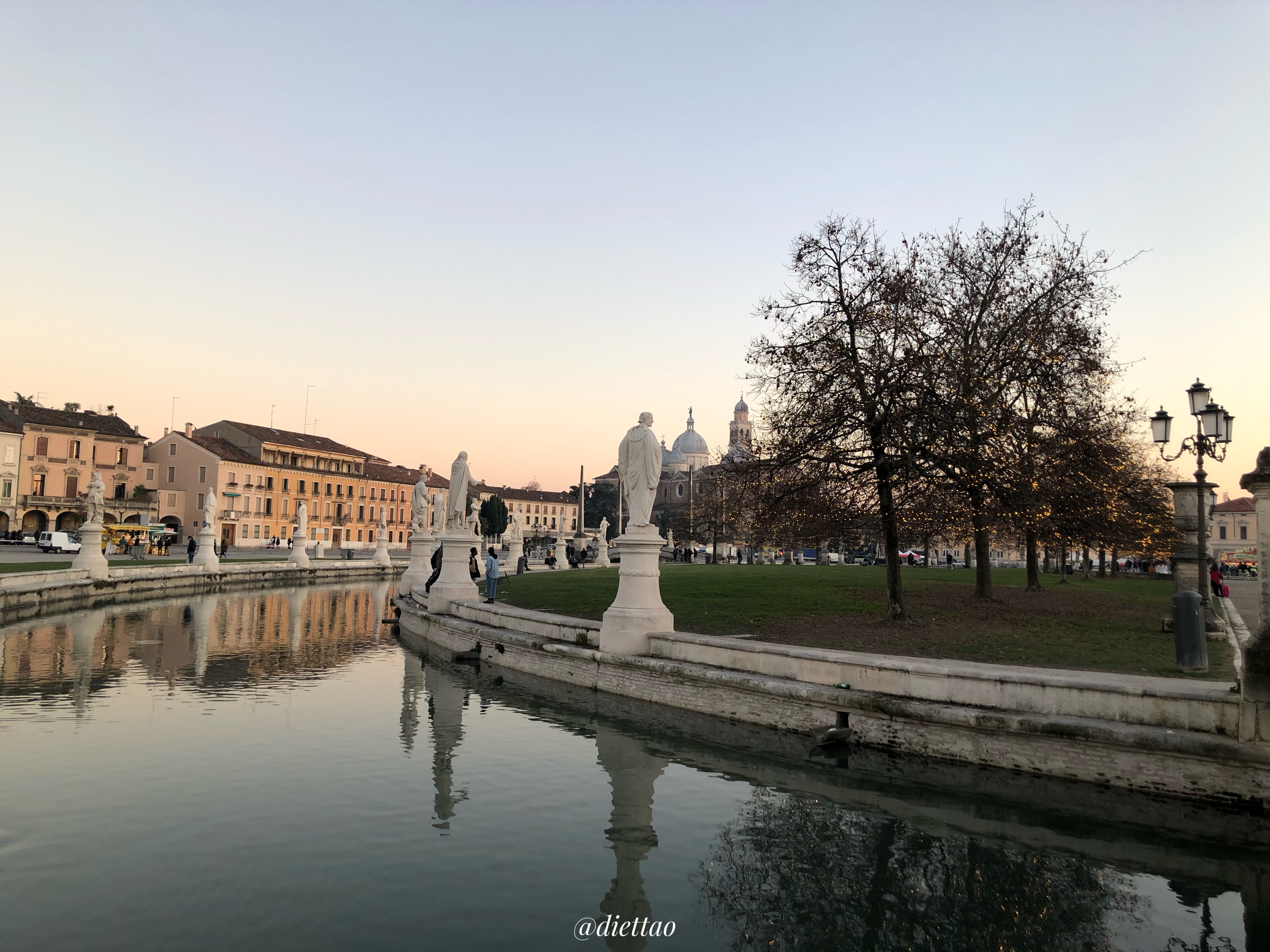和谷草地廣場是帕多瓦市最大的廣場,也是歐洲第五大廣場,也是我這次帕多瓦行程中最喜歡的景點。目前這樣的設計可以追溯到 18 世紀末,這個廣場的中間是一個中央橢圓島,稱為 Memmia 島(約 20,000 平方米),在島的周圍環繞著河道是從Alicorno 運河引水進來,河岸的兩側都有各一排雕像。
