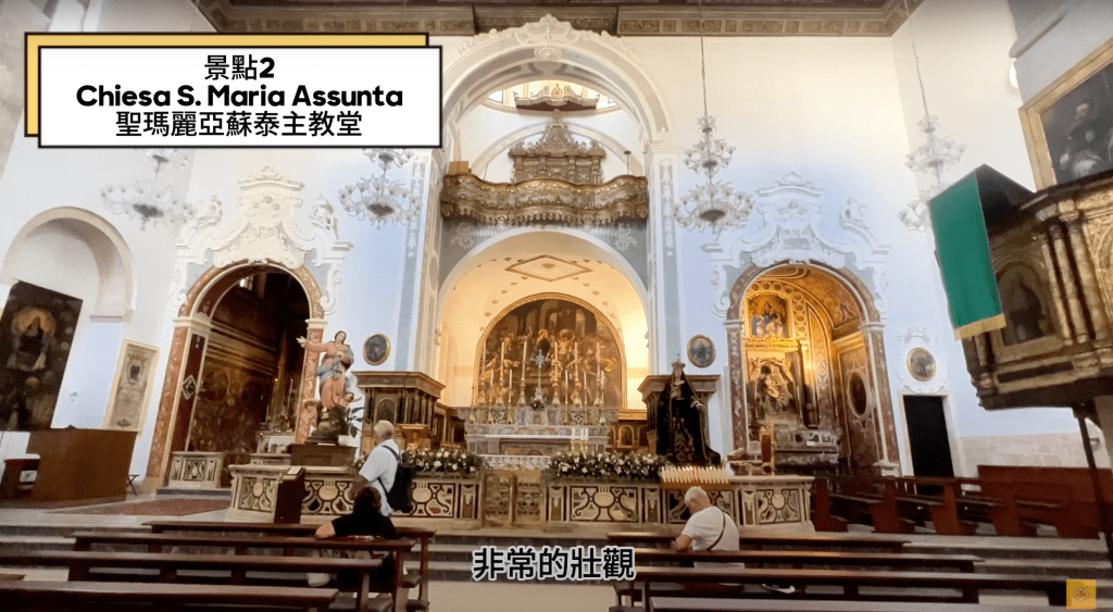 一旦進入內部,就會看到被六根柱子分隔的三個中殿。上方則有那不勒斯學派的十八世紀管風琴,壯觀的主祭壇背後是一幅17世紀的繪畫,個內部的裝飾跟雕刻非常壯觀和精美。