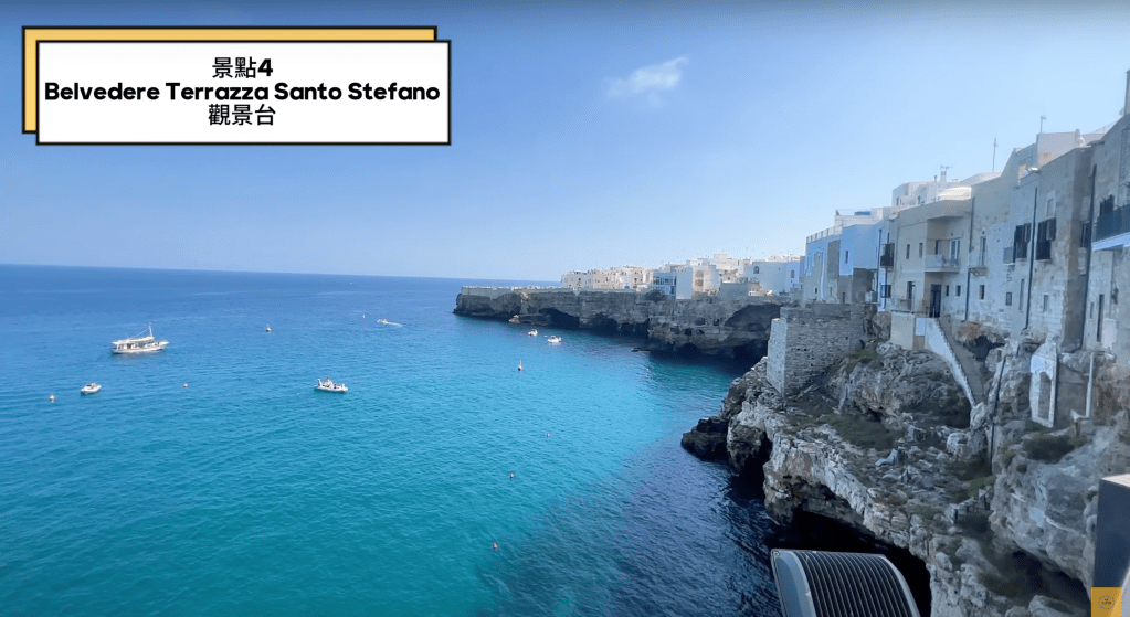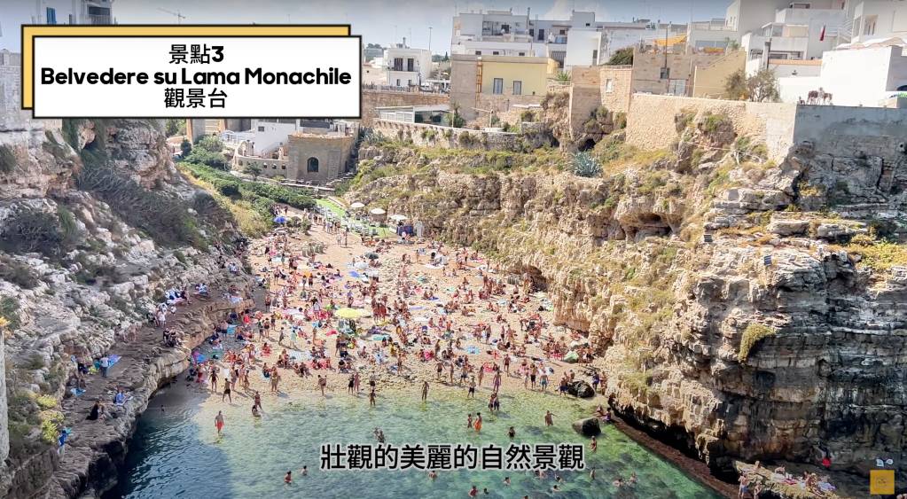 因為這觀景台他可以看到整個沙灘 ~就是我們剛開始進城時的那個沙攤 。那這個海灘叫做Lama Monachile ,它位於整個城市的市中心 ,就是一開始我們還沒有進入到拱門之前~