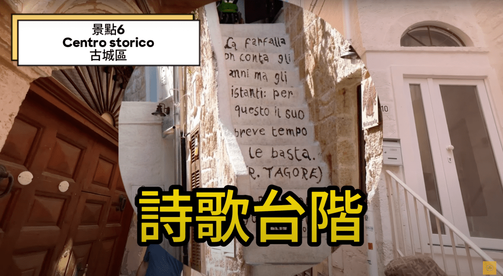 漫無目的地漫步在濱海波利尼亞諾的小巷中本身就是一個景點,整個城市受到是阿拉伯、拜占庭、西班牙和諾曼等過去文化的影響,所以很多細節等著你去發掘~其中以階梯上的詩作最為特殊,在巷子裡閒晃時,其實很容易就能看到這些詩歌台階」Vicolo della Poesia