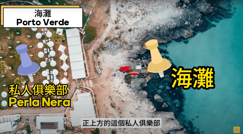 - Porto Verde海灘位於普利亞大區,海水呈現美麗淺綠色,隱藏在岩壁間,提供私人俱樂部Perla Nera租借躺椅和陽傘服務。