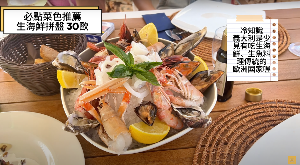 - 推薦品嚐生海鮮拼盤、生鮪魚茄子塔塔、義大利海鮮麵和混合海鮮炸物。