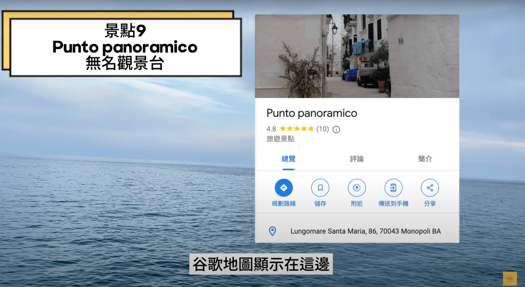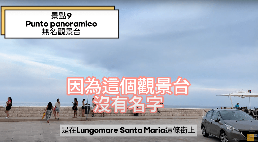 走著走著我們到了觀景台~這個觀景台是在Lungomare Santa Maria 這條街道上,lungomare就是沿海的意思,santa maria 就是聖母瑪莉亞,如同我先前介紹莫諾波利舊港的時候有說過,這座城市的首護者就是聖母瑪莉亞~這裡是一個必來打卡拍照的景點~