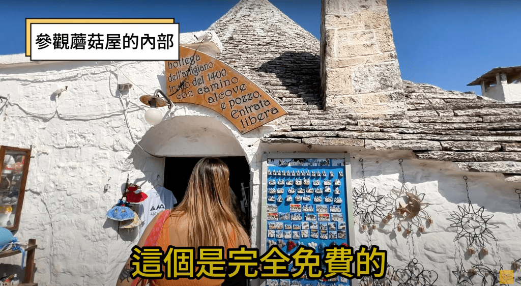 經典的特魯洛有一個圓錐形的屋頂,頂部有所謂的尖塔,屋頂是灰色的,在這裡可以看到蘑菇屋屋頂內部的原貌,那保有這樣的房屋其實也有好處,因為石灰石的有冬暖夏涼的效果,還記得上一集有提到為什麼普利亞大區有很多城市都是白色建築嗎?概念是一樣的,都是為了避暑