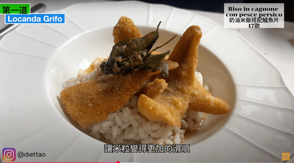 將白米飯煮熟後,再用大量的奶油)和鼠尾草簡單炒拌,使米飯吸滿奶油的香氣,讓米粒變得更加滑順香濃。且米粒粒粒分明~有點像我們炒飯~鱸魚片選用的是科莫湖當地的淡水鱸魚,魚片經過輕輕煎炸,外層香脆,內裡則是細嫩多汁。我特別喜歡那香脆的鼠尾草,為這道菜增添了很多層次感。