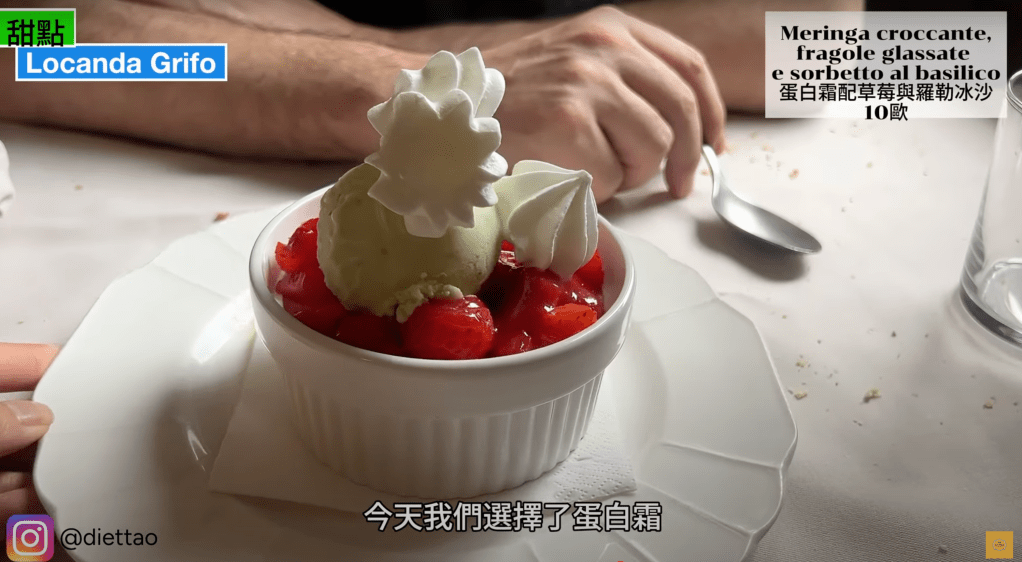 接下來是甜點環節,今天我們選擇了脆皮蛋白霜,這道甜點搭配著新鮮的草莓和羅勒冰沙,聽起來是不是超吸引人?