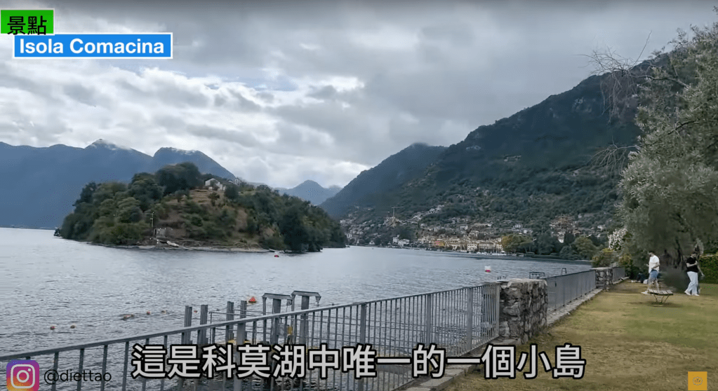 飯後我們在湖邊躺下休息,從這裡可以看到Isola Comacina 這是科莫湖唯一的小島。這個小島長約600米,寬只有200米,總面積約6公頃,覆蓋著典型的地中海茂密植被。島上有橄欖樹、菩提樹和月桂樹,因為這裡擁有溫暖宜人的氣候,非常適合種植橄欖和生產當地的橄欖油。