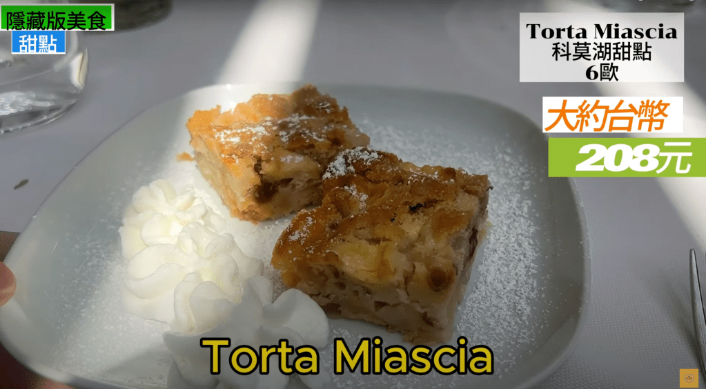 甜點時間~我們點了科莫湖經典甜點Torta Miascia ,說白了就是「把剩下的東西變成好吃的」,超有鄉土味!以前人為了不浪費麵包,把家裡硬掉的麵包加上牛奶、雞蛋、糖,再丟一堆當季的水果像蘋果、梨子、葡萄乾什麼的,拌一拌拿去烤,結果沒想到變成一道經典甜點!