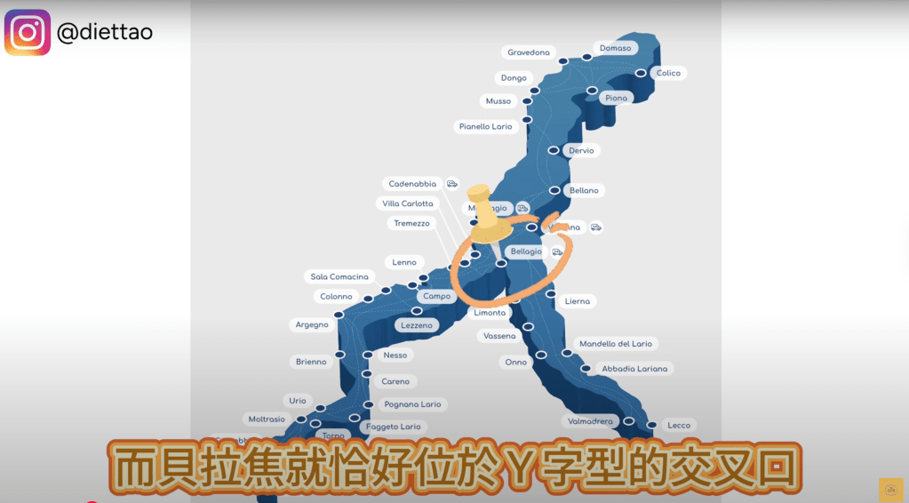 打開科莫湖地圖你會發現,湖的形狀是一個倒立的 Y 字型,而貝拉焦就剛好位於交叉口的位置,三面環湖的絕美景色讓它成為最迷人的小鎮,也因此贏得「科莫湖上的珍珠」之稱。